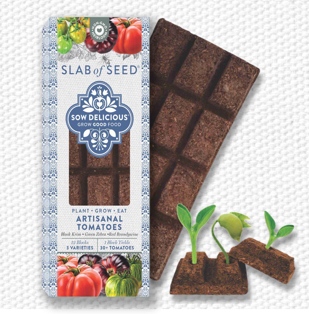 The ‘Slab of Seed’ is our original invention, handmade from a special blend of organically enriched super-soil and infused with the finest Heirloom seed sourced from expert farmers from around the world. The slab itself will hold water 3x longer than the soil it is planted in, is easy to space and plant and the added soil pro-biotics improve the growth of the plant and the taste of the harvest. This Slab of Seed will grow you 3 delicious heirloom* tomato varieties: Black Krim – Green Zebra – Red Brandywine (*Heirloom seed is the purest & oldest seed on earth – read below why I chose these delicious varieties)