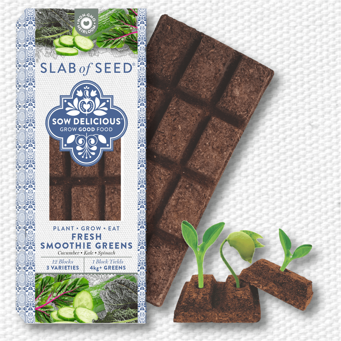 Our award winning ‘Slab of Seed’ is made from organically enriched super-soil and infused with the finest Heirloom seed grown by expert farmers from around the world. The slab itself will hold water 3x longer than the soil it is planted in, is easy to space and plant and the added soil pro-biotics improve the growth of the plant and the taste of the harvest. This Slab of Seed will grow you 3 delicious heirloom* smoothie green varieties: Cucumber – Kale – Spinach (*Heirloom seed is the purest & oldest seed on earth – read below why I chose these delicious varieties)