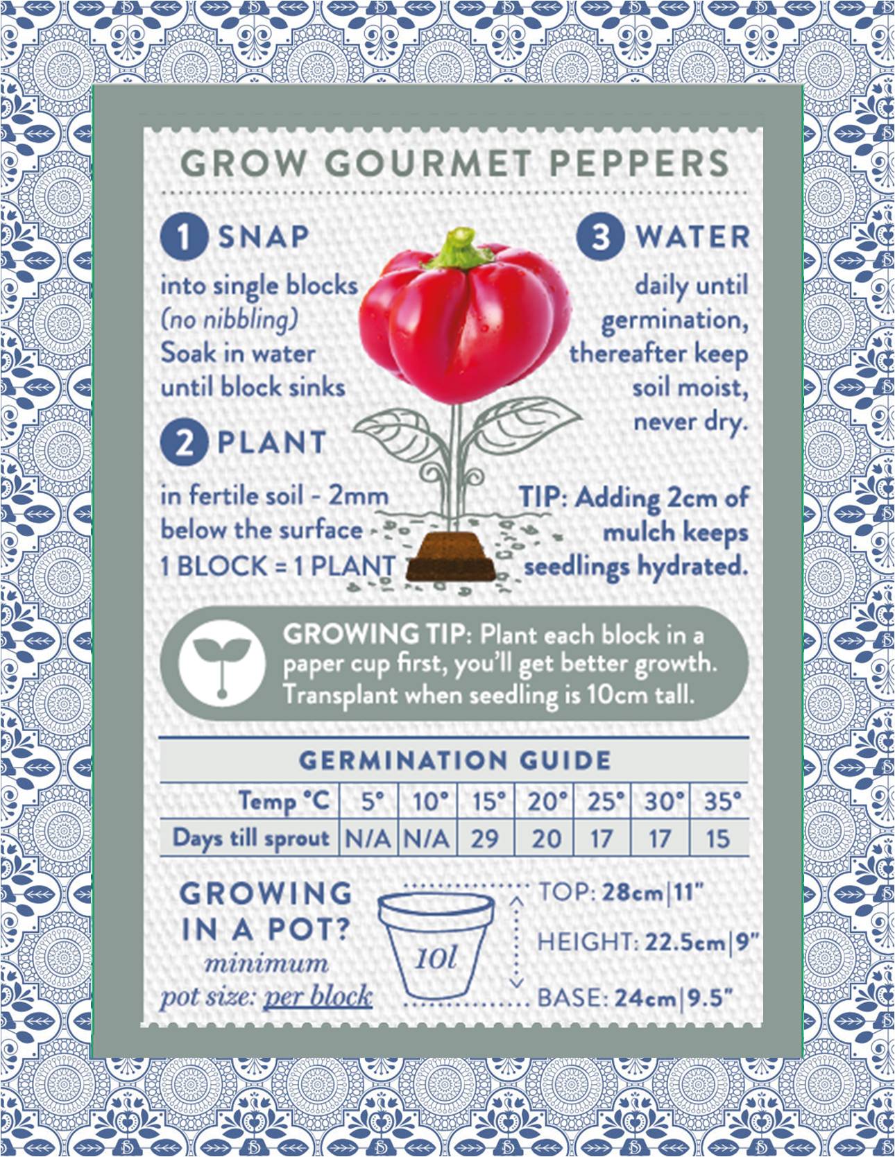 The ‘Slab of Seed’ is our original invention, handmade from a special blend of organically enriched super-soil and infused with the finest Heirloom seed sourced from expert farmers from around the world. The slab itself will hold water 3x longer than the soil it is planted in, is easy to space and plant and the added soil pro-biotics improve the growth of the plant and the taste of the harvest. This Slab of Seed will grow you 3 delicious heirloom* sweet pepper varieties: Chocolate Beauty – Hungarian Yellow Wax – Topepo Rosso (*Heirloom seed is the purest & oldest seed on earth – read below why I chose these delicious varieties)