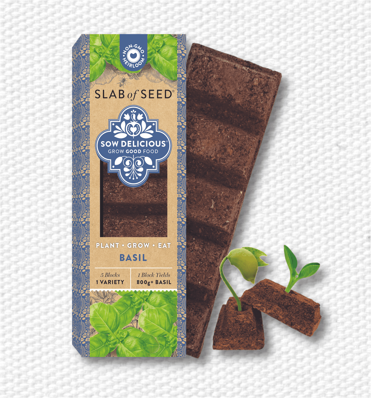 The ‘Slab of Seed’Â is our original invention, handmade from a special blend of organically enriched super-soil and infused with the finest Heirloom seed sourced from expert farmers from around the world. The slab itself will hold water 3x longer than the soil it is planted in, is easy to space and plant and the added soil pro-biotics improve the growth of the plant and the taste of the harvest. This Slab of Seed will grow you a delicious heirloom* basil variety: Italian Large Leaf (*Heirloom seed is the purest & oldest seed on earth – read below why I chose this delicious variety)